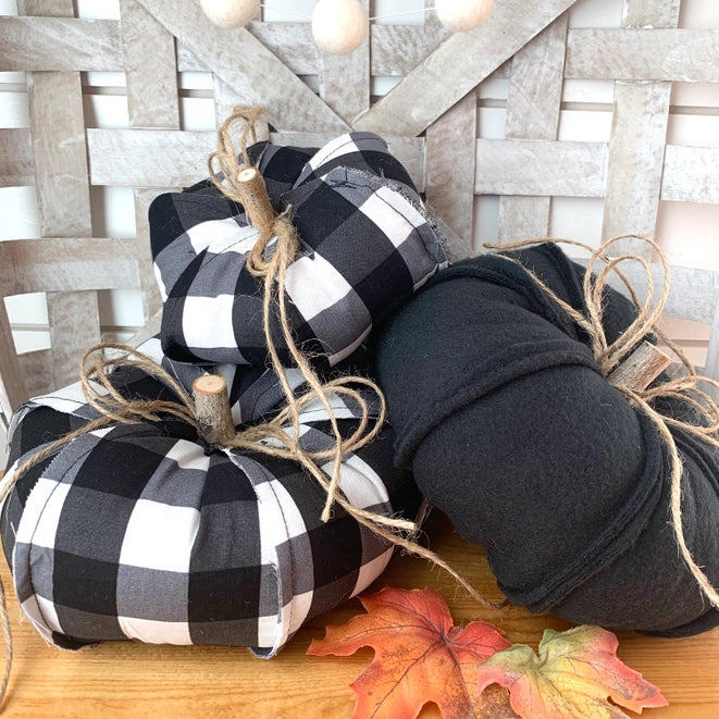 Bring a touch of farm-fresh charm to your fall décor with our Sweet Pumpkin Set, perfect for adding a modern yet rustic feel to your home. Handpicked for Milk & Co. Boutique, this handcrafted collection by Kate + Em features three pumpkins in popular prints and textures that reflect today’s cozy farmhouse style. The set includes two printed fabric pumpkins and one cozy fleece pumpkin, all with natural branch stems and exposed seams for that perfect rustic, homestead look.