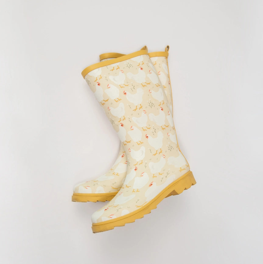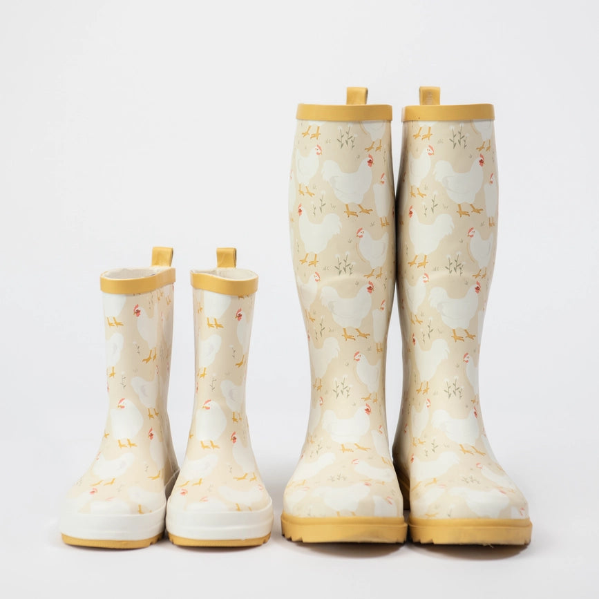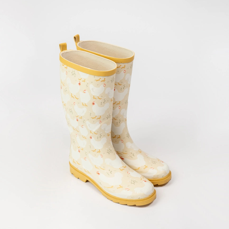 Tend to the chickens in style while staying dry with our Chicken "Rain" Boots for Adults. These boots are made with durable, water-resistant material to keep you comfortable no matter the weather. The pale-yellow design, featuring a charming all-over white chicken pattern with yellow trim and soles, brings a playful farm-inspired touch to your rainy day wardrobe. Whether you’re tending to the garden or running errands, these boots are perfect for adding a bit of countryside flair to any outfit.