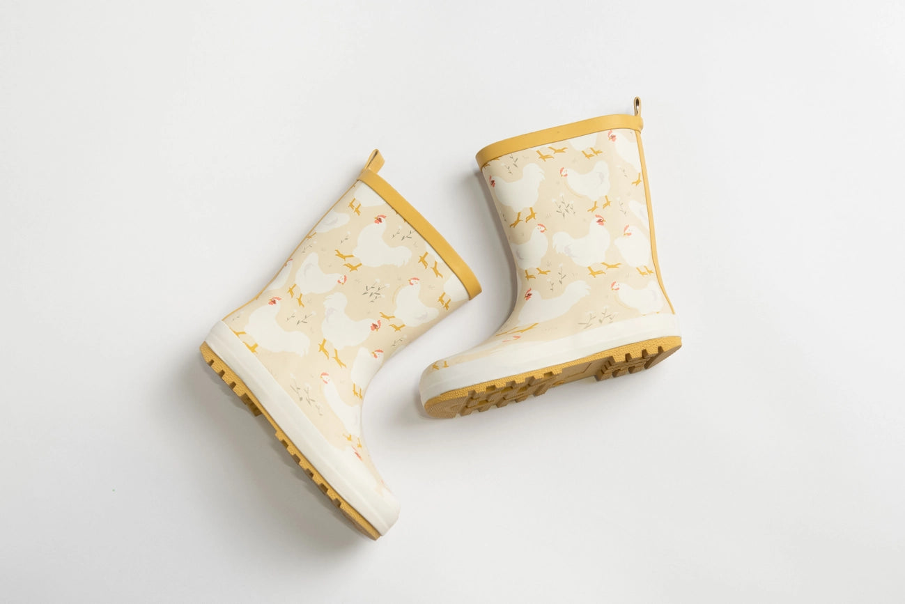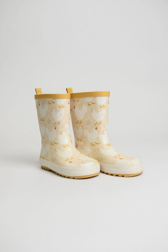 Keep your little one’s feet dry and stylish with our Chicken Toddler "Rain" Boots, perfect for splashing through puddles and exploring farm life. Crafted from durable, water-resistant material, these boots offer excellent protection against rain, mud, and other elements. The pale yellow design is adorned with an all-over pattern of charming white chickens, complemented by vibrant yellow trim and soles for a fun and playful look.