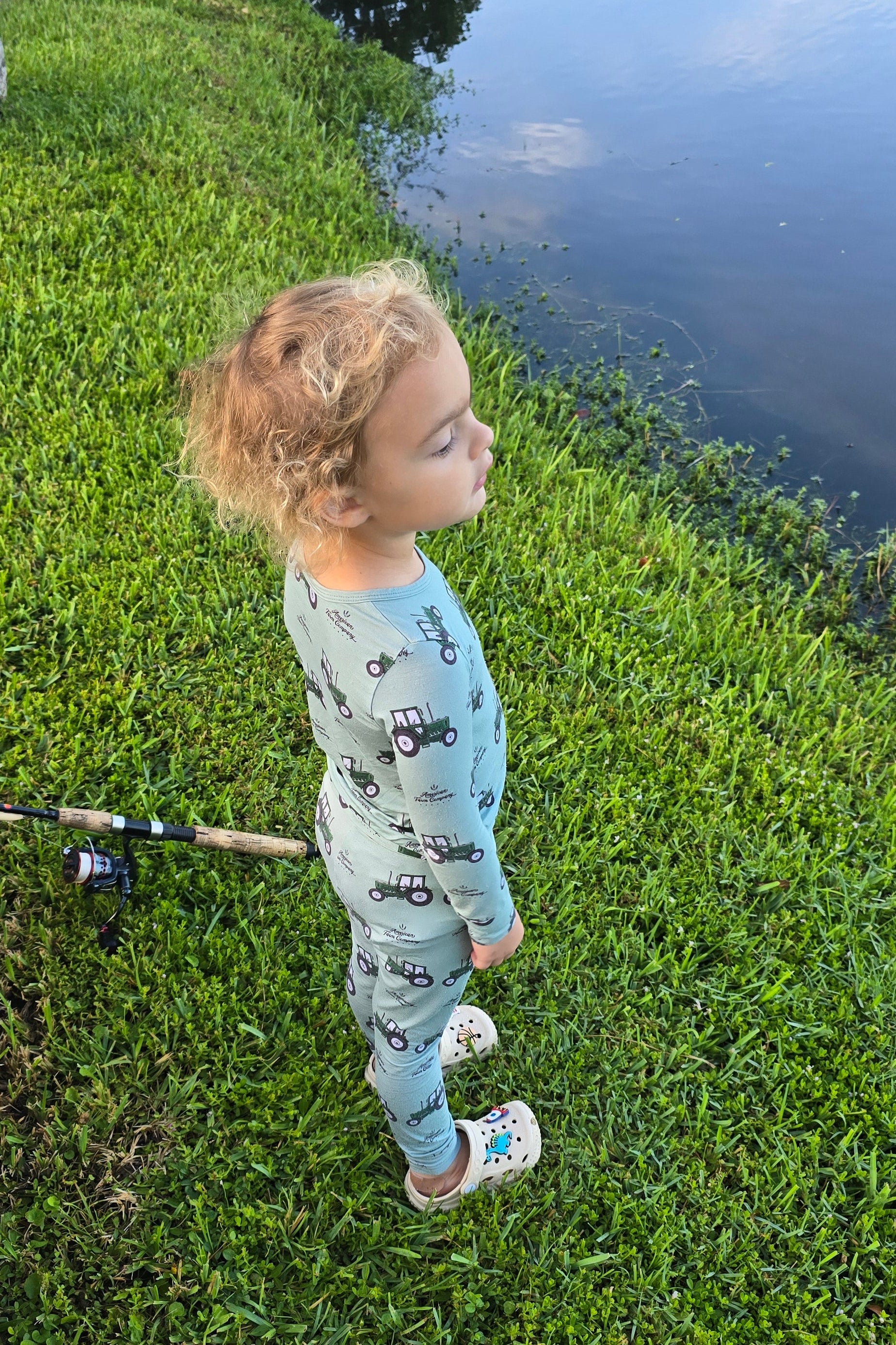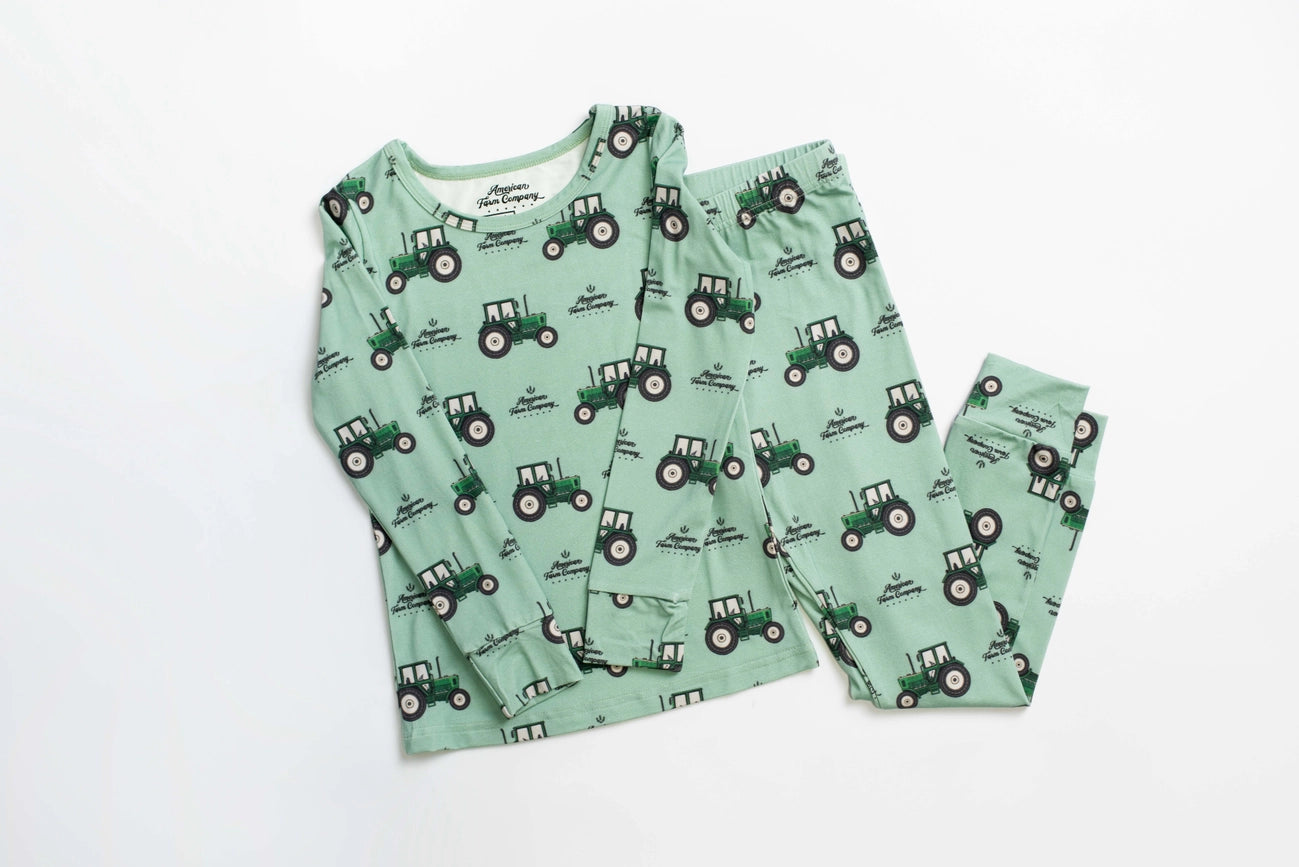 Keep your little one cozy and stylish this fall with our Bamboo AFC Green Tractor Toddler Pajamas. This 2-piece footless pajama set features a soothing sage green color with an all-over green tractor pattern, perfect for little farm enthusiasts. Crafted from a super-soft blend of 95% bamboo viscose and 5% spandex, these pajamas are breathable, stretchy, and gentle on sensitive skin.