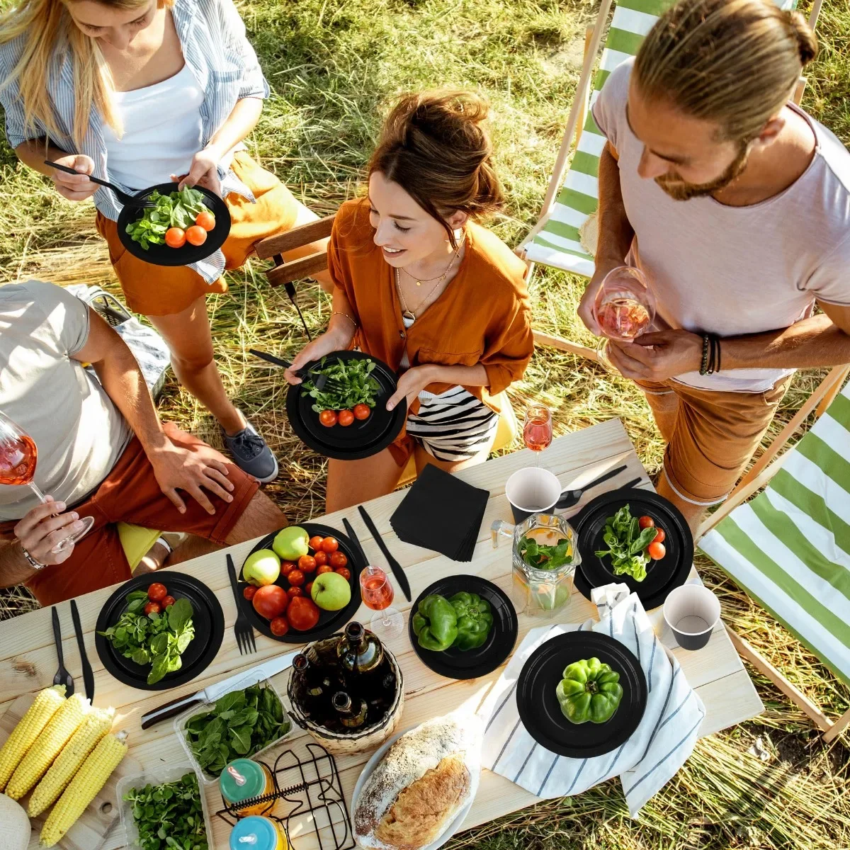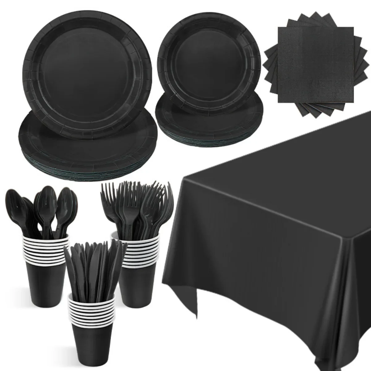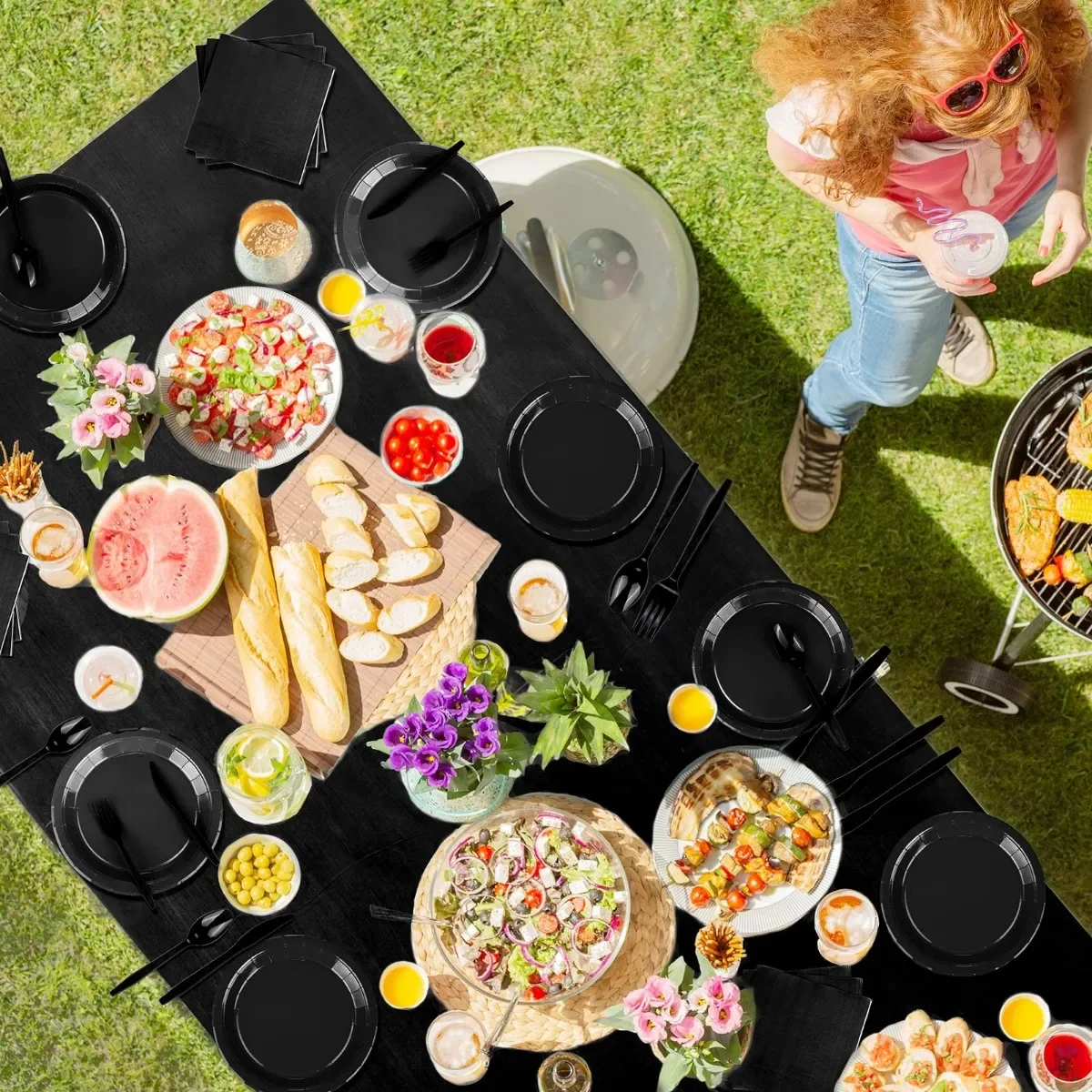 - Value Package: You will receive 24 pieces of 9-inch Black dinner plates, 24 pieces of 7-inch Black dessert plates, 24 pieces of Black paper cups, 24 pieces of Black paper napkins, and 24 sets of knives, forks and spoons,1 pieces of 137*274cm Black tablecloth, sufficient quantity and various kinds can well satisfy your party needs and use.